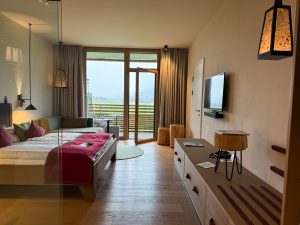 Unsere Unterkunft im Naturtrakt des Tauern Spa ist eine wahre Wohlfühloase. Die natürliche Gestaltung des Zimmers mit warmem Holz, gemütlichen Stoffen und hellen Farben spiegelt die alpine Umgebung perfekt wider. Das Highlight? Ein Balkon mit Blick auf die Berge, der perfekte Ort für eine kleine Auszeit am Morgen oder Abend. Der Sitzbereich lädt zum Kaffeetrinken ein, und im Hängesessel lässt sich ein Buch super entspannen. Die Ausstattung ist durchdacht: Das bequeme Healthness-Bett, eine täglich neu gefüllte Minibar und das moderne Badezimmer, das einem kleinen Spa gleicht, lassen keine Wünsche offen.